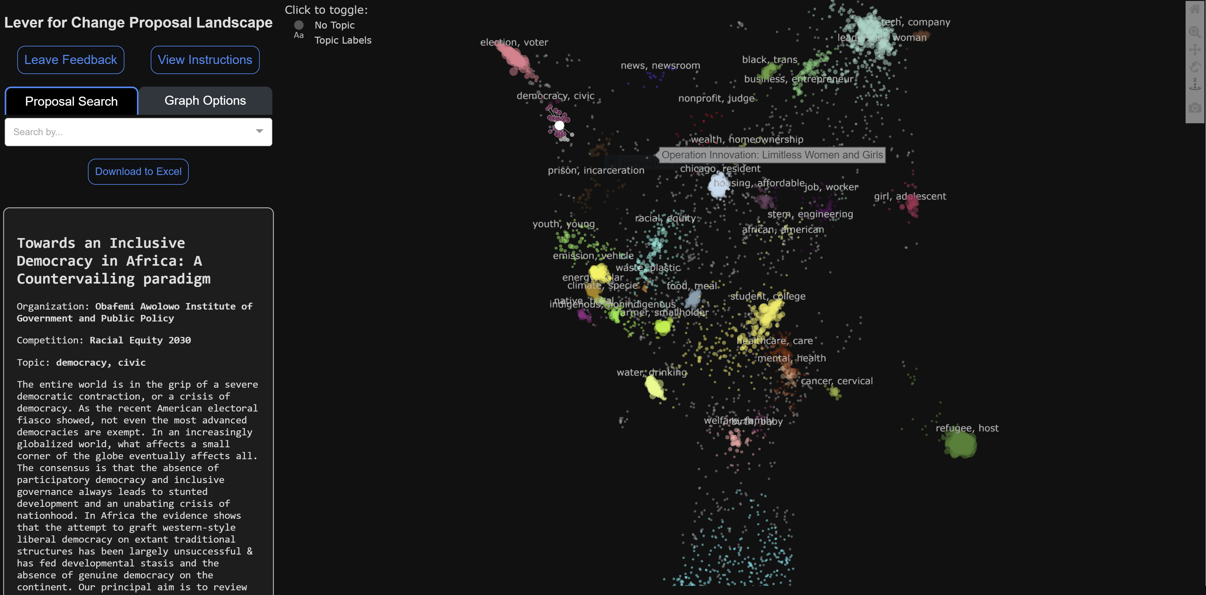 Using a machine learning approach built on Dash and scikit-learn, the LFC Proposal Landscape application allows users to explore and find connections between thousands of non-profit grant applications.