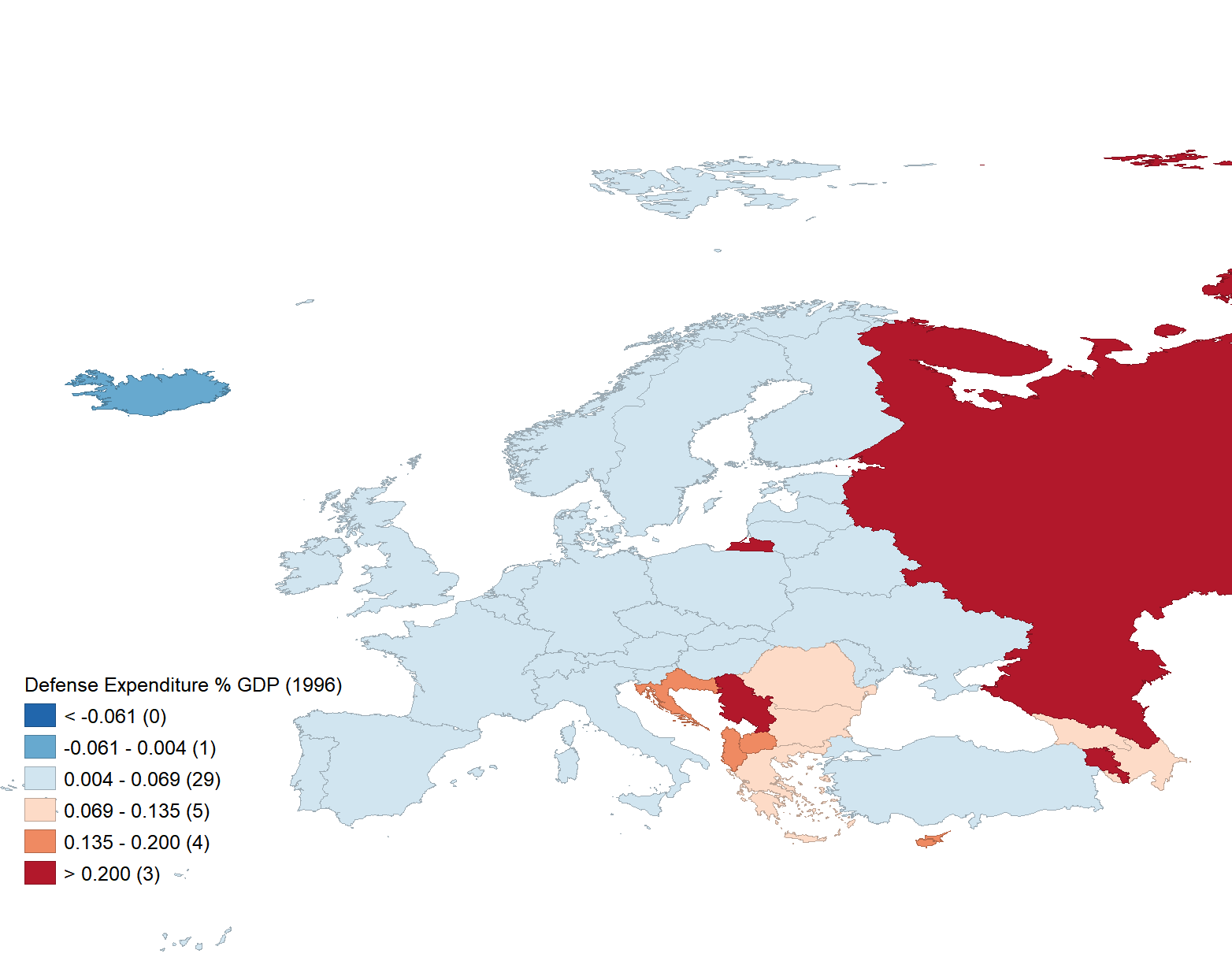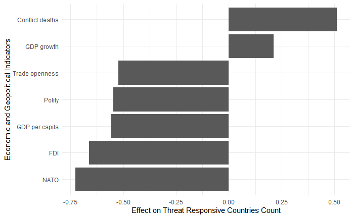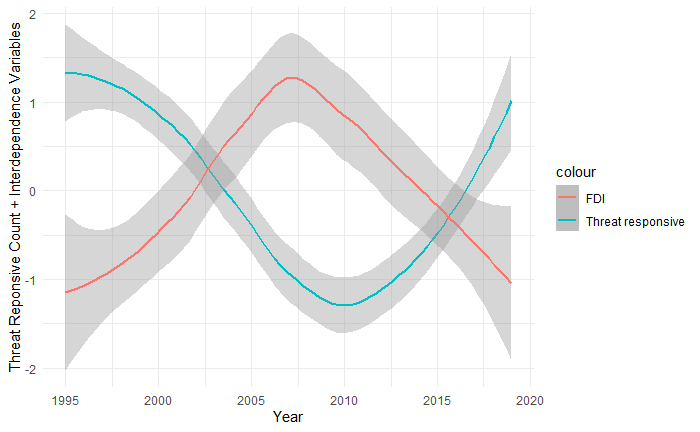 What is the relationship between the level of economic interdependence among states and the geography of defense spending? I argue that as the level of economic interdependence in a region increases, the geographic structure of defense spending weakens. States in a highly interdependent system will have defense expenditures that correlate weakly to the defense expenditures of nearby states. Conversely, in a less interdependent system, states with high defense expenditure are more likely to be located near other states with high defense expenditure. The argument is evaluated by constructing spatial models of defense spending in Europe in the period of 1995-2019. The models will produce the Moran’s I statistic, which measures the geographic structure of defense spending, and a count of threat responsive countries, defined as states with high defense expenditure in proximity to other states with high defense expenditure. Foreign direct investment flows is used to operationalize the economic interdependence variable. The resulting linear regressions shows a significant inverse relationship between the level of foreign direct investment and the number of threat responsive countries